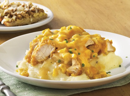 Transform chicken tenders into down home comfort food with layers of mashed potatoes, corn, chicken gravy and cheddar cheese.