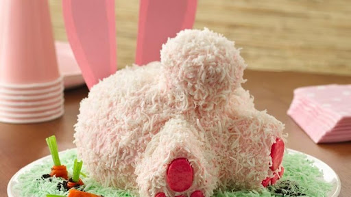 Spoon frosting into large bowl. Add red food color to make desired pink color. Place bowl cake on tray cut side down; spread 1/3 cup frosting over cake. Use frosting to adhere cupcakes to bowl cake for feet and bunny tail. Use toothpicks if necessary. Place marshmallow halves, cut sides down, on tops of 2 cupcakes to make heels of feet. Spread thin layer of frosting over side and top of cake to seal in crumbs. Freeze cake 30 to 45 minutes to set frosting.