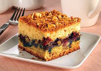 Preheat oven to 350°. Grease and flour a 9x13 pan. Combine flour, baking powder, baking soda, and salt in a bowl. Set aside. In a separate bowl with an electric mixer cream the butter and sugar until fluffy. Add eggs one at a time beating well after each addition. Add the flour mixture alternating with the sour cream and VANILLA. Beat for an additional 2-3 minutes, until well blended. Combine the streusel ingredients except for the blueberries and reserve 3/4 cup. Toss the rest of the streusel with the blueberries. Spread 1/3 of the batter in the pan, top with 1/2 of the berry mixture, another third of the batter, the rest of the berries, and finally the remaining batter. Sprinkle on the reserved 3/4 cup streusel topping. Bake 50-55 minutes or until a toothpick comes out clean. Cool 10 minutes on a wire rack. Carefully turn the pan over onto a serving plate or cake stand and remove from pan. When completely cooled (2 hours or so) sprinkle with powdered sugar.