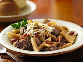 3. About 15 minutes before serving, make pasta as directed on package. Stir pasta, oil and pepper into beef mixture. Serve with cheese.