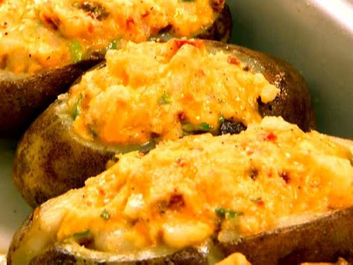 Nestle the hollowed out potatoes in the prepared dish. Evenly divide the potato mixture among the potato shells and top with the remaining 1/4 cup cheese. Place the potatoes into the oven and cook, about 20 minutes. Remove from the oven and serve immediately.