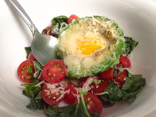 BAKED****Baked Avocado Eggs with Arugula, Basil & Cherry Tomato Salad