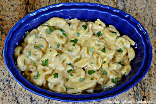 Sprinkle on ¼ cup to ½ cup of shredded Parmesan cheese (depending on your tastes), stir to combine and remove from the heat. Pour the tortellini into a serving vessel, & garnish with chopped fresh parsley if desired.