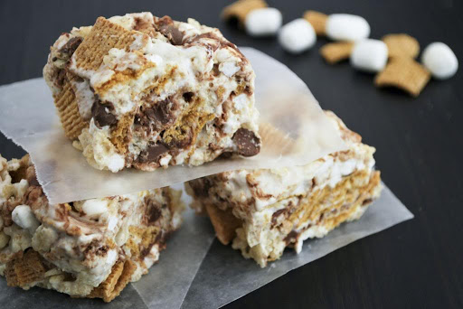 Mix together the rice krispies, Golden Grahams, Marshmallow Bits, and chocolate chips. Set aside. Melt the butter in a saucepan over medium heat. Turn the heat down to the lowest setting and add the marshmallows. Stir until almost totally melted, then add the vanilla extract. Continuing stirring until the marshmallows are all melted, slow and steady.