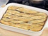 Use a sharp knife to make 4 cuts lengthwise through the layered phyllo at 1 1/2 inch intervals. (You should end up with 5 lengthwise strips 1 1/2 inches wide.) Now use your knife to cut diagonally across the strips at 1 1/2-inch intervals to form diamond shapes. You should end up with approximately 36 diamond-shaped pieces of baklava in the baking dish.