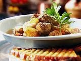 Caramelize the diced onion in a saute pan with a little olive oil over medium heat. Add the sausage, egg, onion, thyme, parsley, and cheese to the bowl of a food processor and pulse until they all come together. Season with salt and pepper. Heat a skillet with a few tablespoons of olive oil until just smoking. Use a small ice cream scoop to drop meatballs onto skillet. Cook, turning, until golden brown.
