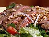 Place lettuce on 4 individual plates. Top lettuce with watercress and bean sprouts. Top with steak slices, tomatoes, cucumber, and scallions. Set aside.