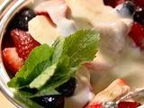 Serve bowls of fruit with a dollop of lemon yogurt on top. Top each with a sprig of fresh mint.