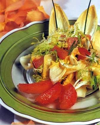 To serve, place 3 endive leaves pointed up and out on each plate and top with dressed salad; garnish with reserved grapefruit sections and mint chiffonade.