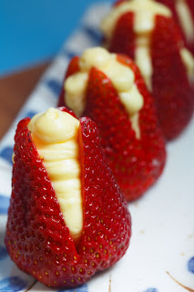 A word to the lazy: an alternate way of serving this would be to quarter or slice the strawberries and serve the filling in a small dish. The filling can be spooned over the cut strawberries. Slicing the strawberries and using them as scoops for the filling works well too.