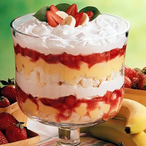 Place half of the cake cubes in a trifle bowl or 3-qt. serving bowl. Layer with half of the pudding, bananas, strawberry sauce and whipped cream. Repeat layers. Cover and refrigerate for at least 2 hours. Garnish with additional fruit if desired.