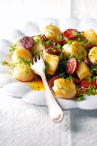 Return the chorizo to the pan with the scallops, add the lemon juice and let bubble for a few seconds before arranging on a serving plate and sprinkling with parsley.