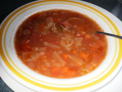 FAVORITE! My family enjoys this soup all year. A tomato based soup with chopped vegetables which seasons and give great flavor! A great recipe to forget and let cook while you work or shop. Enjoy with crusty bread or crackers.