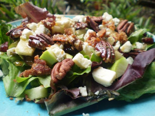 Combine lettuce, watercrest, cheese and walnuts. Make dressing and pour over lettuce to desired taste and consistency.