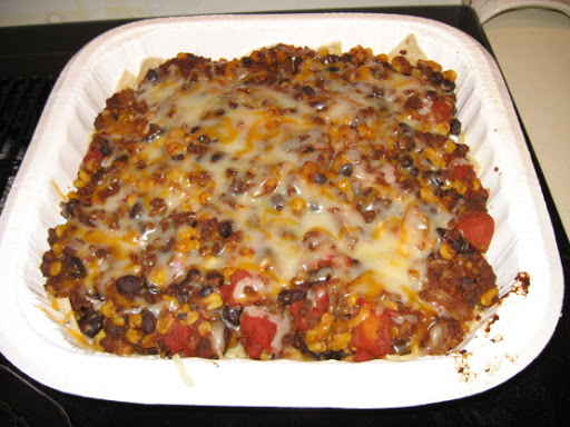 Meanwhile spray 12x8-inch (2-quart) baking dish with nonstick cooking spray. Cut each tortilla in half; place 8 halves in bottom of sprayed baking dish, overlapping slightly.