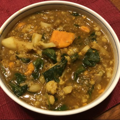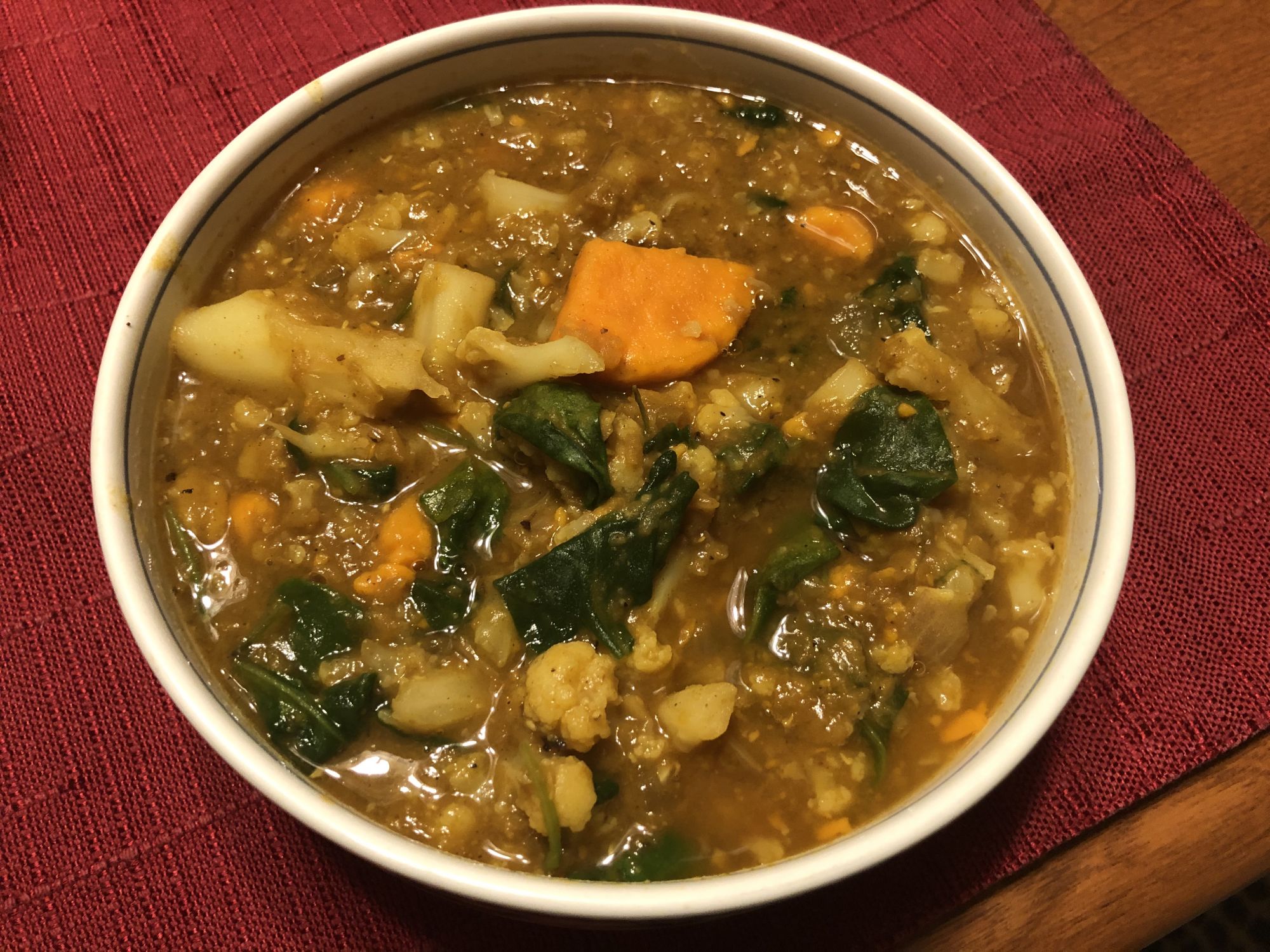 4. Stir in the cauliflower and sweet potato. Cover and reduce the heat to medium-low. Simmer for 20-25 minutes, until the cauliflower and sweet potato are tender. Season with the salt and pepper, and add more curry powder, if desired. Stir in the spinach and cook until wilted.