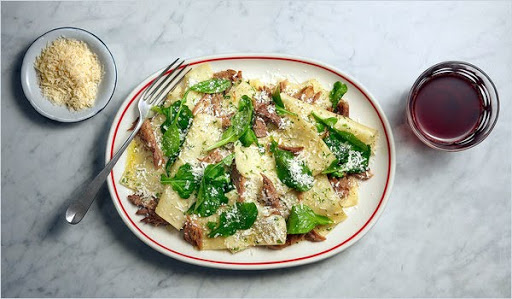 7. Meanwhile, cook the pasta in salted water according to the directions on the package, 10 to 12 minutes. When it is finished, drain and add to the sauce along with a splash of pasta water. Simmer for 1 minute, then add the lemon juice, half of the cheese, a tablespoon of olive oil and the parsley. Stir to incorporate.