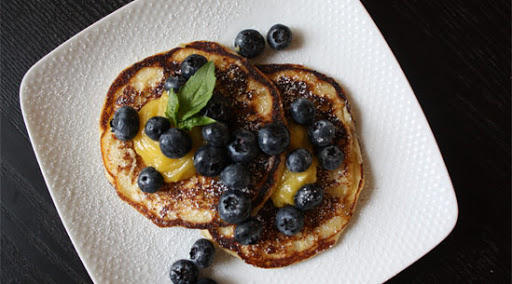4. To serve, place 2 or 3 pancakes on each plate and garnish with lemon curd, fresh berries, basil leaves and confectioners' sugar.