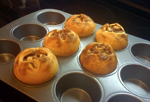 I used a 5-biscuit package, and 1 medium Pippin apple. I omitted the raisins, thinking that would be too sweet for our taste, and substituted chopped pecans for the walnuts because, you got it, that's what I had in the pantry.