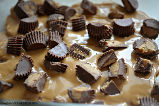 7. Decorate the top with crushed nutter butter cookies, peanut butter cups and a drizzle more of peanut butter.