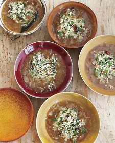 Ladle soup into 6 bowls; top each with chestnut mixture.