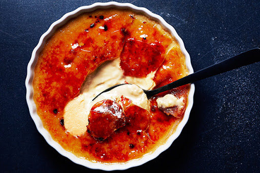 Just before serving, sprinkle custards evenly with sugar and heat with torch until sugar is melted and caramelized to a deep amber color. Your goal is to make a thin, smooth, brittle crust that shatters when broken.