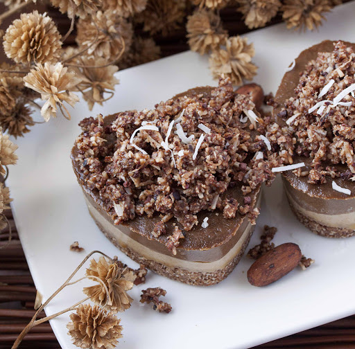 Chocolate Caramel Valentines Hearts with a Chocolate Coconut Streusel - raw vegan