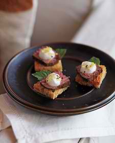Whisk together yogurt, remaining tablespoon oil, 1/4 teaspoon salt, and lemon juice. Top each toast with 1 mint leaf, 1 lamb slice, 1/4 teaspoon yogurt, zest and reserved spice blend.