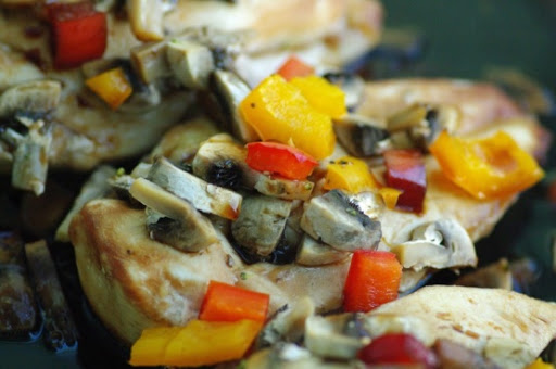 Spread green peppers and mushrooms evenly over chicken, and continue to bake, covered 20 or more minutes until mushrooms are tender.