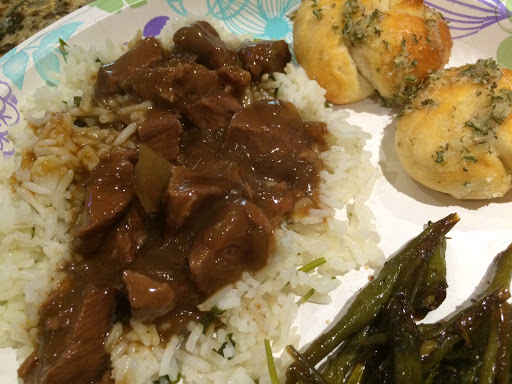 Mix together all ingredients and bake at 350 degrees until bubbling. Then reduce heat to 300 degrees for 3 1/2 hours, covered. Serve over rice.