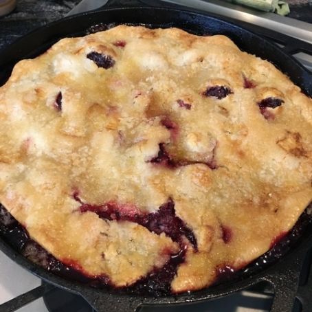 Unroll second pie crust over top of berries, sealing at the edges of the skillet.