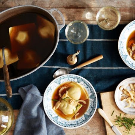 To serve, ladle broth into soup bowls, then add 2 dumplings to each bowl. Garnish with chives and fried onions.