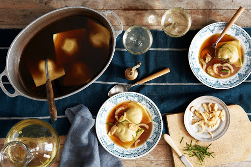 Bring beef broth to a simmer in a stock pot over medium heat. Transfer dumplings to simmering broth. Cook until dumplings float and are al dente, soft but firm, 15 minutes.