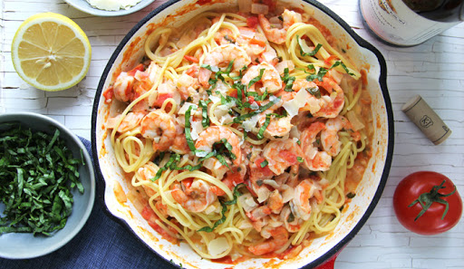 Toss the tomato and shrimp sauce with spaghetti noodles.
