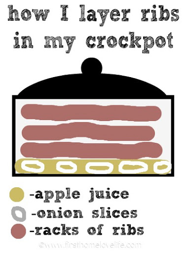 Slice onions into about 1 inch rounds. Now pour in just enough apple juice to cover the onion slices, and then add your ribs. More then one rack will probably need to be cut into half racks for them to fit. Put the lid on and let them cook for about 6 hours on LOW heat.