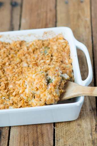 Remove from the oven and add the cheese and cornflakes. Bake for an additional 5-8 minutes or until the cheese is melted. Allow to cool for 5 minutes and serve.