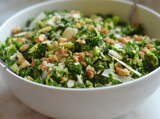 Kale & Brussels Sprout Salad with Walnuts, Parmesan & Lemon-Mustard Dressing
