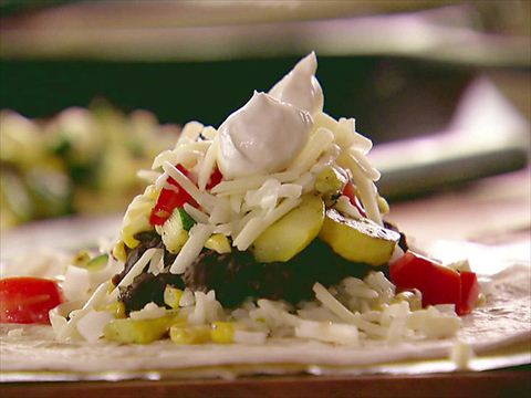 Top with grated cheese, chopped tomatoes, chopped onions and sour cream. Tuck in the ends and roll into a burrito shape.