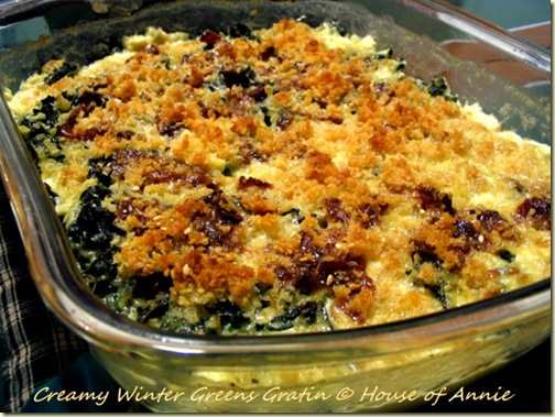 Crumble the bacon or pancetta over the greens. Sprinkle on the cheese. Pour the seasoned cream over all, and top with the buttered breadcrumbs. Bake until the gratin is brown and bubbly, about 25 min. Let rest for 10 to 15 min. before serving.