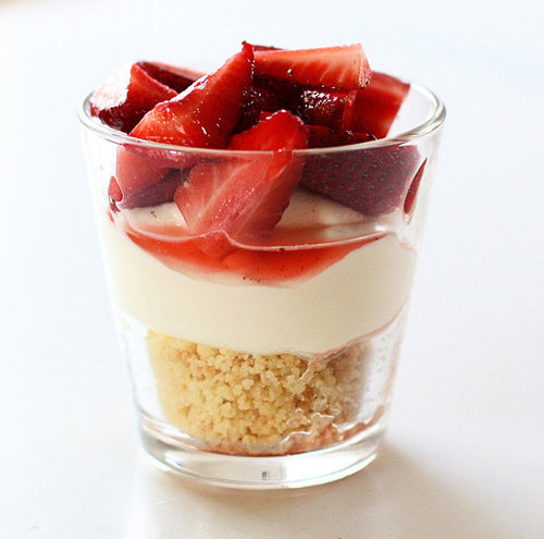Divide the sugar-shiny strawberries between the glasses, to give a glossy red-berried layer on each glass.