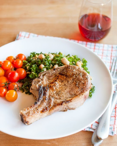 1. Brine pork chops in 3 cups water and 3 TBS kosher salt for at least four hours (initially dissolve salt in one cup hot water). Heat cast-iron large skillet with 2 TBS olive oil in 400 degree oven. Remove from oven and place over medium-high heat. Cook chops until browned on one side (3-4 minutes) then turn over and transfer skillet back to oven for 6-10 minutes to finish cooking (less for thin chops and more for thicker chops). Transfer chops to a plate and cover tightly with foil.