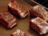 Season the short ribs with salt and pepper. In a large Dutch oven or soup pot over medium-high heat, add the oil. Sear the ribs on all sides until well colored and slightly charred. Remove the ribs from pan to a plate and set aside.