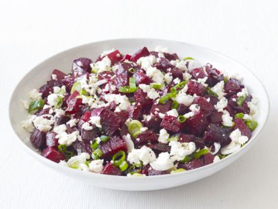 Peel 4 medium beets and cut into 1/2-inch pieces. Toss with 1 tablespoon olive oil, 1 teaspoon salt, and pepper to taste on a baking sheet. Roast at 450 degrees F, stirring once or twice, until tender, 35 minutes. Transfer to a bowl; toss with 4 chopped scallions and 2 teaspoons lemon juice. Top with crumbled feta.