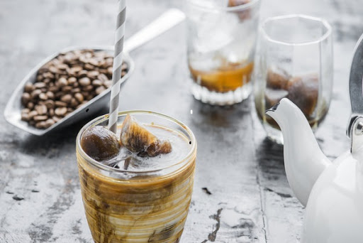 Place all ingredients in a high-speed blender (such as a Vitamix) and process for one full minute, until smooth, creamy and frothy. Pour your coffee in a glass, add ice cubes and transfer to the freezer for 5 minutes. Drink cold.
