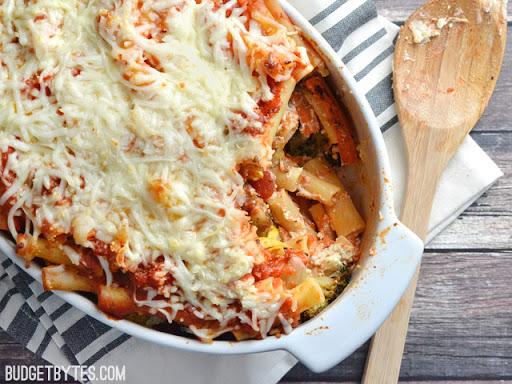 5.Coat an 8x8 inch casserole dish with non-stick spray. Spread ⅓ of the pasta and marinara sauce over the bottom. Layer ½ of the ricotta mixture over the pasta, then ½ of the roasted vegetables. Repeat these three layers, then end with one final layer of pasta and sauce, and the final cup of shredded mozzarella.