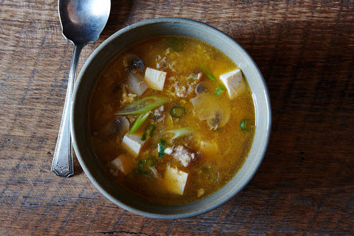 2. Add the stock and mushroom soaking liquid and bring to a simmer. Add the tofu, mushrooms, sugar, vinegar, soy sauce, black pepper, sesame oil, and Sriracha sauce and bring the soup back to a simmer over medium-high heat. Taste the soup. If you want it hotter, add more Sriracha sauce; if you want it more sour, add more vinegar.