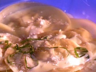 For Sauce: In clean saute pan, melt remaining 4 tablespoons butter, when melted, add in remaining basil, saute until crisp and butter is just very lightly browning. Add in remaining cream and reduce to thickened. Salt and pepper to taste, serve over raviolis immediately.