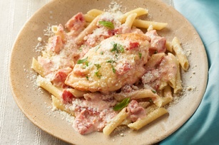 Pound chicken into cutlets. Season with salt and pepper and dust with flour. Add oil and saute on both sides for a few minutes. Transfer to platter. Deglaze pan with vodka (away from flame), return to heat and cook until nearly evaporated. Add broth and lemon juice. Return chicken to pan and ook on each side for 1 minute. Transfer chicken to warm platter. Stir in tomato and cream in sauce. Heat through; pour over chicken. Garnish with scallions.