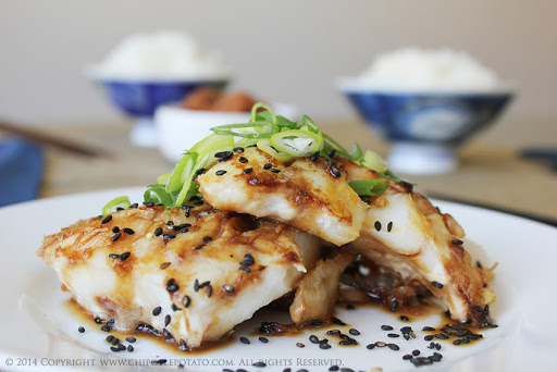 Preheat oven to 400°. Rub cod with oil, then season generously with salt and pepper. Preheat cast iron or other oven-proof skillet over medium high heat. When skillet is very hot, add cod, presentation side down, and sear until a good brown crust develops, 2–3 minutes. Turn cod over, and brush with teriyaki sauce. Place skillet in oven and roast until fish is cooked through, 12–15 minutes.