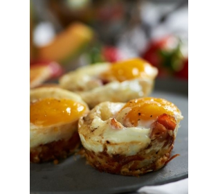 Crumble the bacon pieces and divide evenly among the 12 potato cups. Divide 1/2 cup of the Swiss cheese evenly in each cup over the bacon.